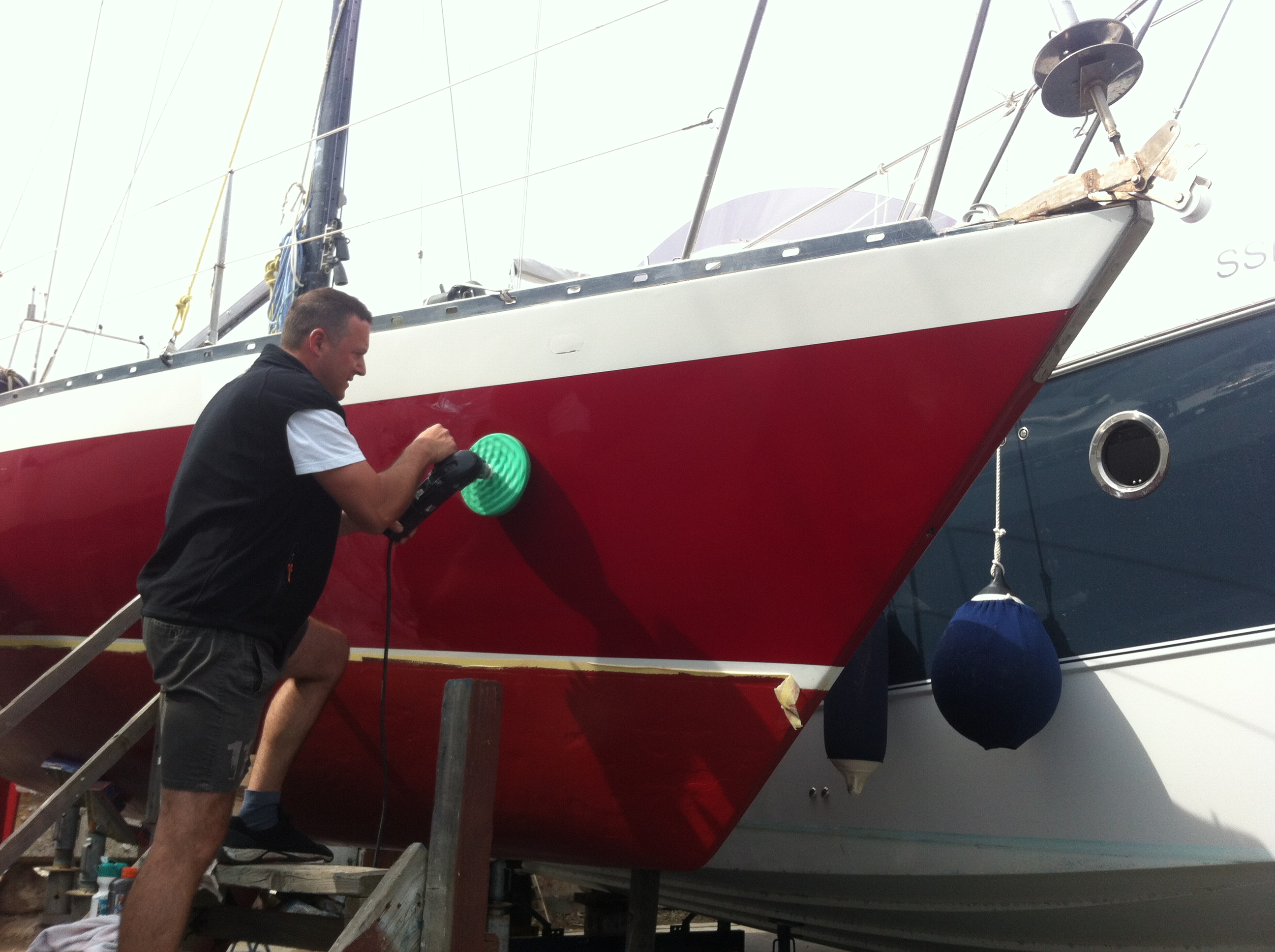 First, we put the tape on the waterline and sanded the hull, cleaned the prop shaft and the propeller, then we put three coats of antifouling, new sacrificial anodes, greased the seacocks, and polished the hull above the waterline… but we had more serious work to do now – it was finally the time to put back and install the engine!